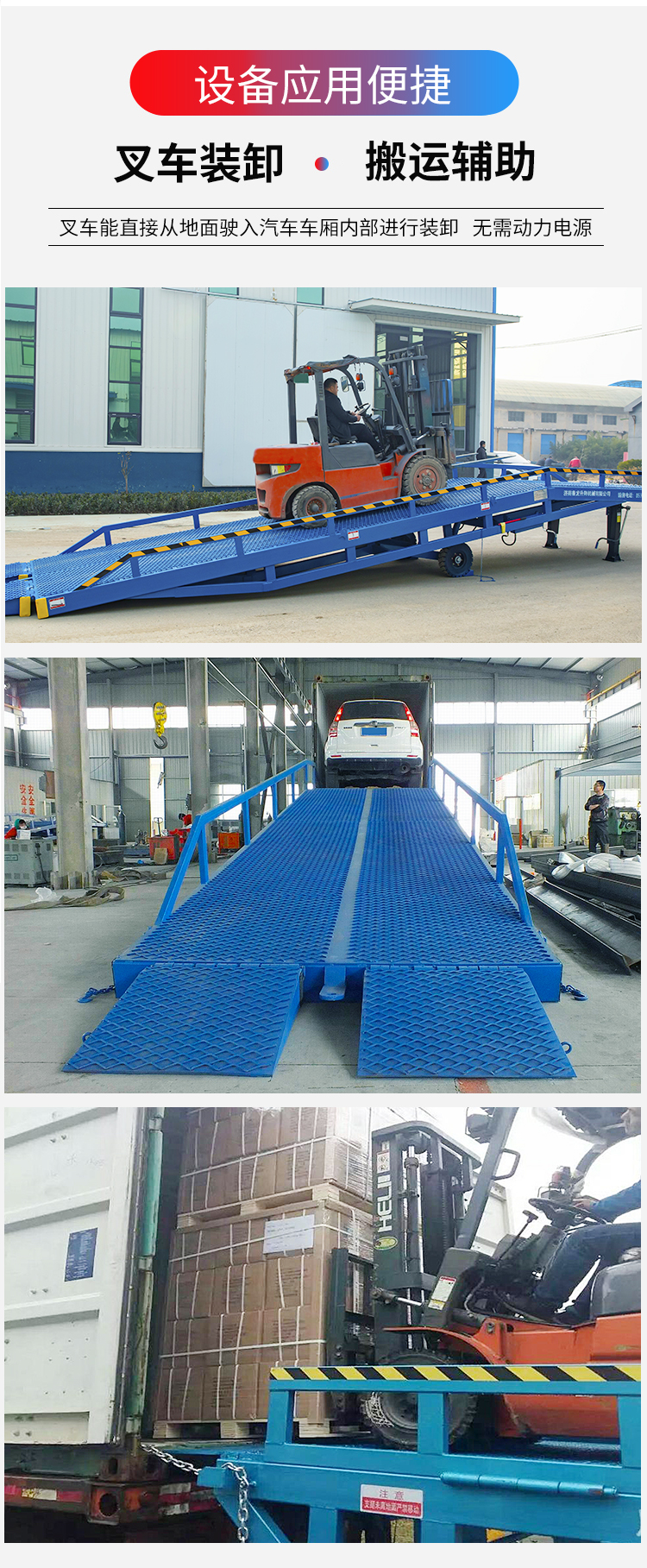 產(chǎn)品介紹:移動式液壓登車橋廣泛用于物流場所,是與叉車配合使用的貨物裝卸專用輔助設備,移動式液壓登車橋相當于一個移動的鋼結(jié)構(gòu)斜坡,通過這個斜坡,叉車能直接從地面駛?cè)肫囓噹麅?nèi)部進行批量裝卸作業(yè)。該液壓登車橋采用人工液壓動力,不需接動力電源。只需單人操作,即可實現(xiàn)貨物的安全快速裝卸。它可使您減少大量勞力,成倍提高裝卸作業(yè)效率,加快物料流通速度,獲取更大經(jīng)濟效益。