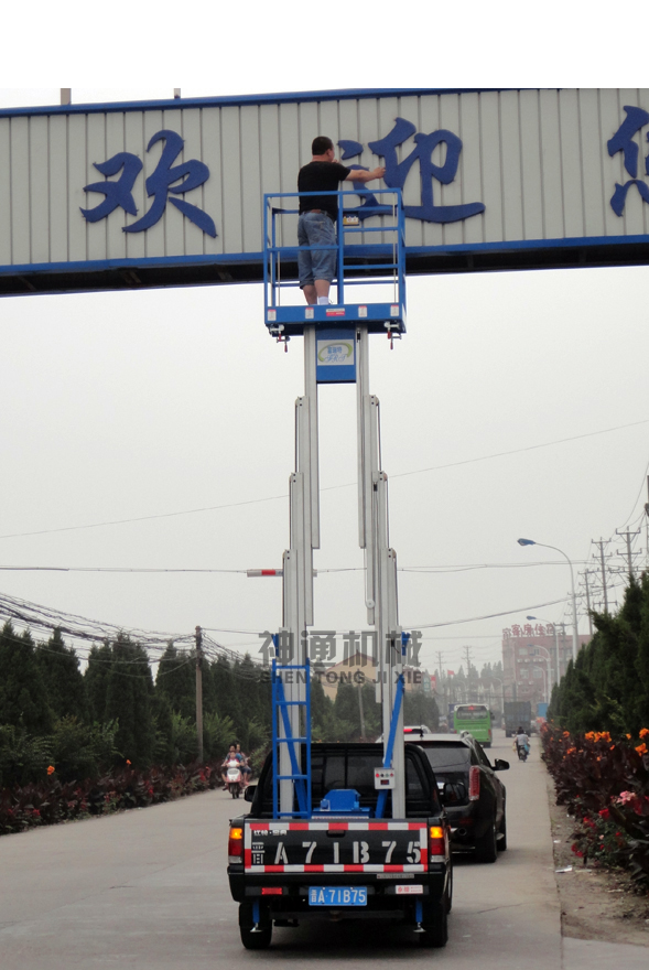 產(chǎn)品規(guī)格:車載鋁合金式升降平臺(tái)根據(jù)升降高度可分為:?jiǎn)沃?/span>6、8、10米,雙柱6、8、10、12米升降平臺(tái),設(shè)備載重150公斤至200公斤。客戶可根據(jù)需求選用解放、東風(fēng)、輕騎、福田、電瓶車等任何車型,設(shè)備直接采用汽車或電瓶的直接動(dòng)力升降。